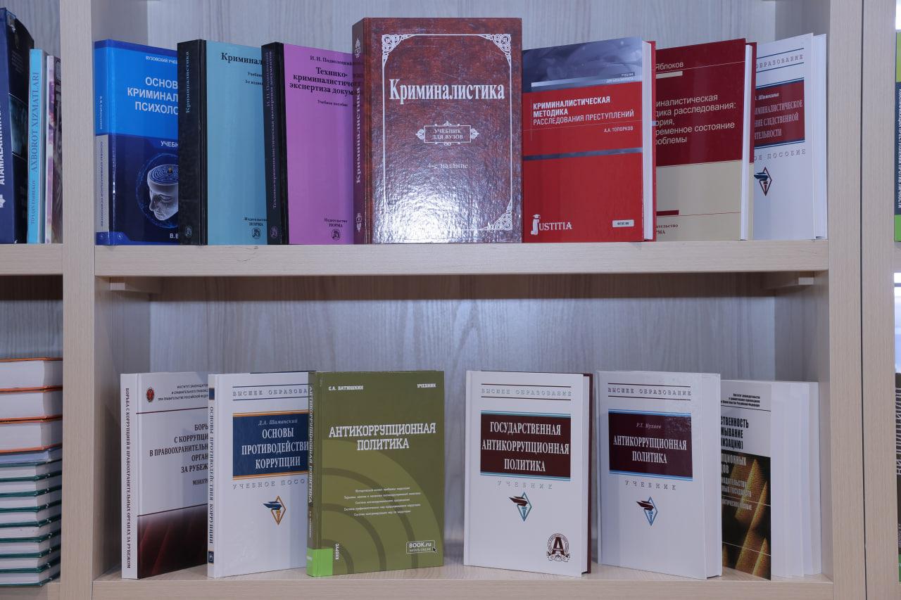 Таълим жараёни ва илмий тадқиқотларни долзарб адабиётлар билан таъминлаш мақсадида кутубхона фонди коррупцияга қарши курашиш, криминология, криминалистика ва тезкор-қидирув фаолияти йўналишлари бўйича янги хорижий нашрлар билан тўлдирилди.